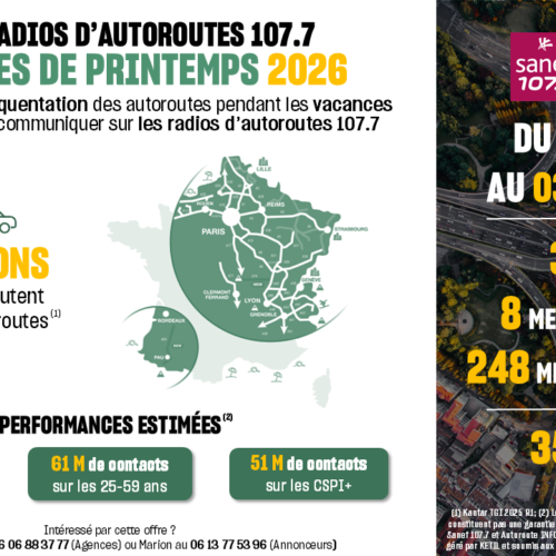 Les radios d’autoroute 107.7 offrent aux annonceurs des espaces publicitaires uniques. Chaque année, une grande majorité de de Français empruntent les autoroutes de France pour leurs trajets quotidiens ou pour partir en congés pour de courts ou de longs séjours.